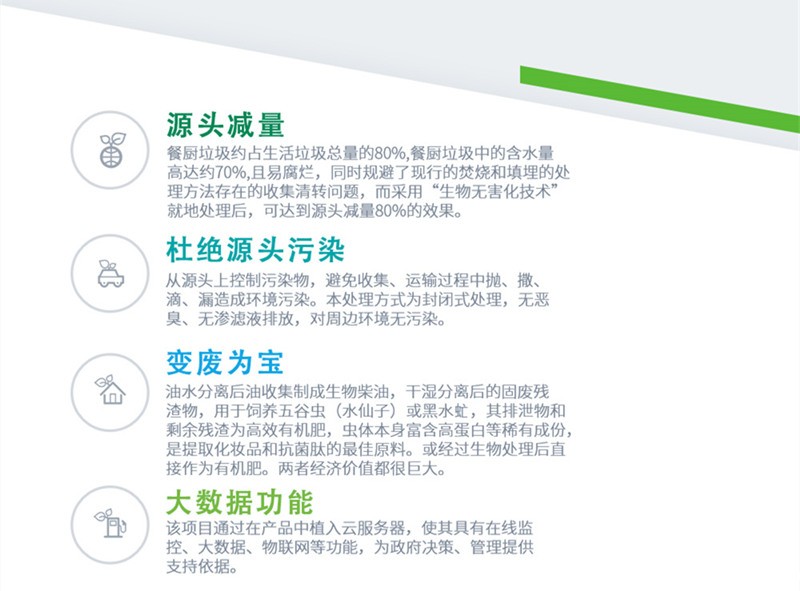 三、本公司系列设备适用餐厨垃圾就地处理和集中处理,设备应用领域:大中型社会餐饮、美食城、美食街、政府机关食堂、企事业单位、学校、部队、医院、会议中心、车站、码头、机场、海舰船、大型超市、商业综合体、农贸市场、蔬菜基地、屠宰场、社区垃圾中转站、旅游景区、高速公路服务区等领域。